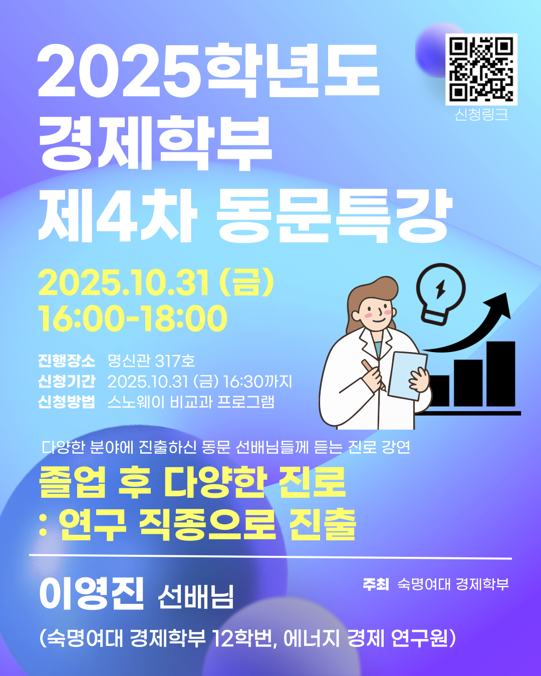 숙명여대 경제학부를 졸업하신 이영진 선배님께서 후배들을 위해 자리해주실 예정이니, 학우 여러분의 많은 관심과 참여 바랍니다.